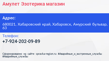 Амулет Эзотерика, магазин по адресу 680021, Хабаровский край, Хабаровск, Амурский бульвар, 63 в дальнейшем Организация, размещена в следующих категориях: