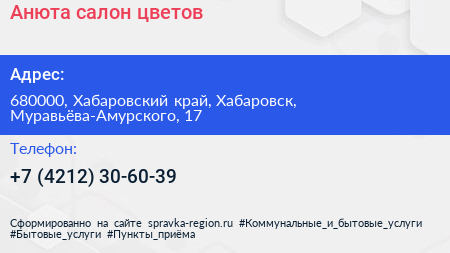 Анюта, салон цветов по адресу 680000, Хабаровский край, Хабаровск, Муравьёва-Амурского, 17 в дальнейшем Организация, размещена в следующих категориях: