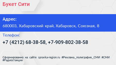 Букет Сити по адресу 680003, Хабаровский край, Хабаровск, Союзная, 8 в дальнейшем Организация, размещена в следующих категориях: