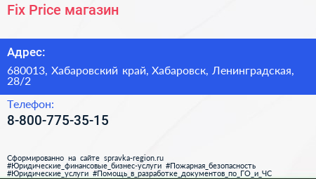 Fix Price, магазин по адресу 680013, Хабаровский край, Хабаровск, Ленинградская, 28/2 в дальнейшем Организация, размещена в следующих категориях: