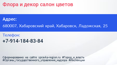 Флора и декор, салон цветов по адресу 680007, Хабаровский край, Хабаровск, Ладожская, 25 в дальнейшем Организация, размещена в следующих категориях: