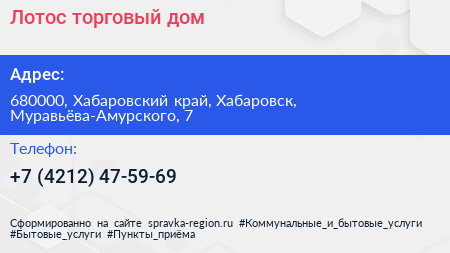 Лотос, торговый дом по адресу 680000, Хабаровский край, Хабаровск, Муравьёва-Амурского, 7 в дальнейшем Организация, размещена в следующих категориях: