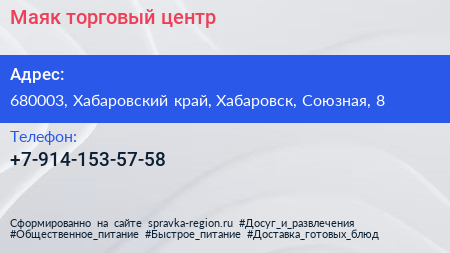 Маяк, торговый центр по адресу 680003, Хабаровский край, Хабаровск, Союзная, 8 в дальнейшем Организация, размещена в следующих категориях: