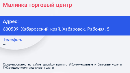 Малинка, торговый центр по адресу 680539, Хабаровский край, Хабаровск, Рабочая, 5 в дальнейшем Организация, размещена в следующих категориях: