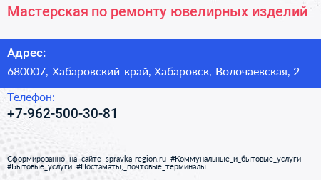 Мастерская по ремонту ювелирных изделий по адресу 680007, Хабаровский край, Хабаровск, Волочаевская, 2 в дальнейшем Организация, размещена в следующих категориях: