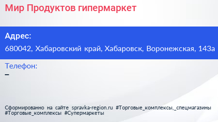 Мир Продуктов, гипермаркет по адресу 680042, Хабаровский край, Хабаровск, Воронежская, 143а в дальнейшем Организация, размещена в следующих категориях:
