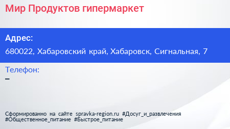 Мир Продуктов, гипермаркет по адресу 680022, Хабаровский край, Хабаровск, Сигнальная, 7 в дальнейшем Организация, размещена в следующих категориях: