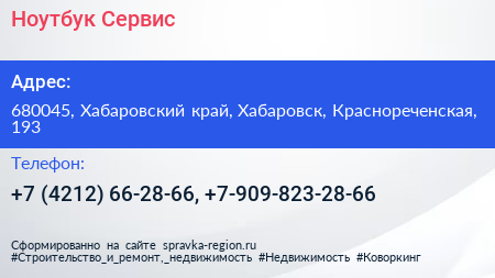 Ноутбук Сервис по адресу 680045, Хабаровский край, Хабаровск, Краснореченская, 193 в дальнейшем Организация, размещена в следующих категориях: