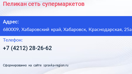 Пеликан, сеть супермаркетов по адресу 680009, Хабаровский край, Хабаровск, Краснодарская, 25а в дальнейшем Организация, размещена в следующих категориях: