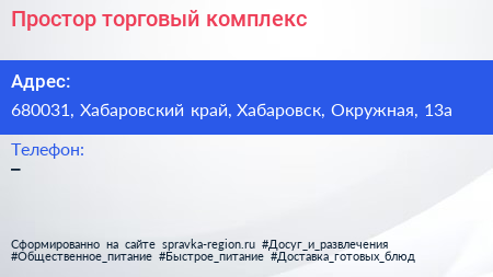 Простор, торговый комплекс по адресу 680031, Хабаровский край, Хабаровск, Окружная, 13а в дальнейшем Организация, размещена в следующих категориях: