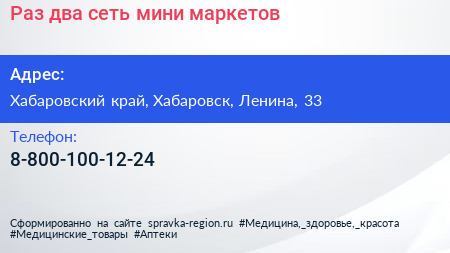 Раз два, сеть мини-маркетов по адресу Хабаровский край, Хабаровск, Ленина, 33 в дальнейшем Организация, размещена в следующих категориях: