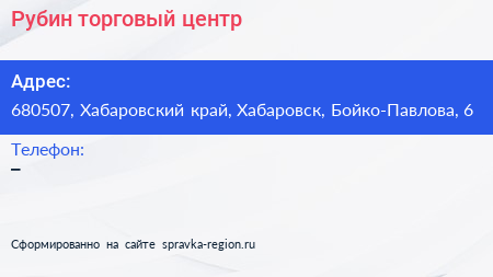 Рубин, торговый центр по адресу 680507, Хабаровский край, Хабаровск, Бойко-Павлова, 6 в дальнейшем Организация, размещена в следующих категориях:
