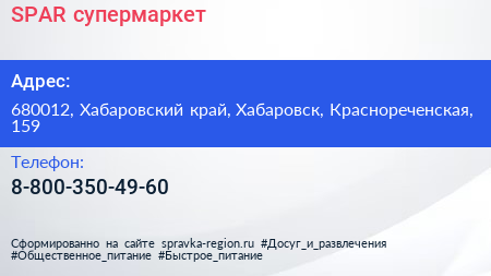 SPAR, супермаркет по адресу 680012, Хабаровский край, Хабаровск, Краснореченская, 159 в дальнейшем Организация, размещена в следующих категориях:
