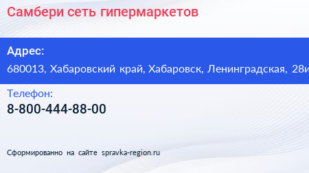 Самбери, сеть гипермаркетов по адресу 680013, Хабаровский край, Хабаровск, Ленинградская, 28и в дальнейшем Организация, размещена в следующих категориях: