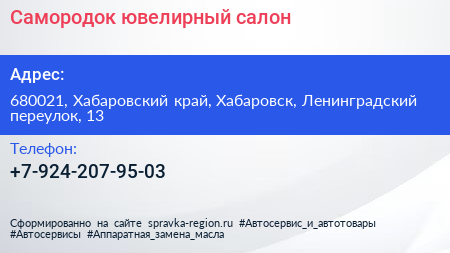Самородок, ювелирный салон по адресу 680021, Хабаровский край, Хабаровск, Ленинградский переулок, 13 в дальнейшем Организация, размещена в следующих категориях: