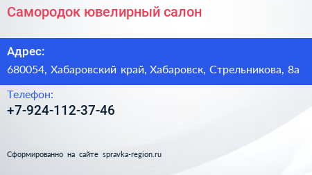 Самородок, ювелирный салон по адресу 680054, Хабаровский край, Хабаровск, Стрельникова, 8а в дальнейшем Организация, размещена в следующих категориях: