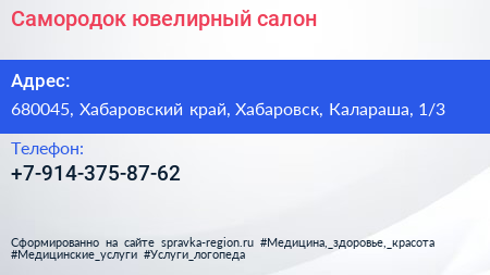 Самородок, ювелирный салон по адресу 680045, Хабаровский край, Хабаровск, Калараша, 1/3 в дальнейшем Организация, размещена в следующих категориях: