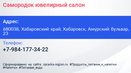 Самородок, ювелирный салон по адресу 680038, Хабаровский край, Хабаровск, Амурский бульвар, 23 в дальнейшем Организация, размещена в следующих категориях: