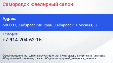 Самородок, ювелирный салон по адресу 680003, Хабаровский край, Хабаровск, Союзная, 8 в дальнейшем Организация, размещена в следующих категориях: