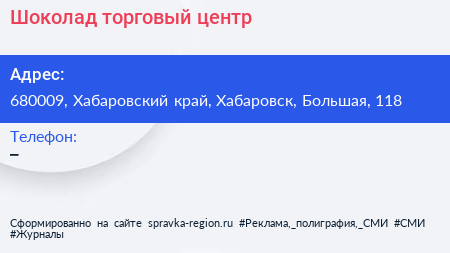 Шоколад, торговый центр по адресу 680009, Хабаровский край, Хабаровск, Большая, 118 в дальнейшем Организация, размещена в следующих категориях: