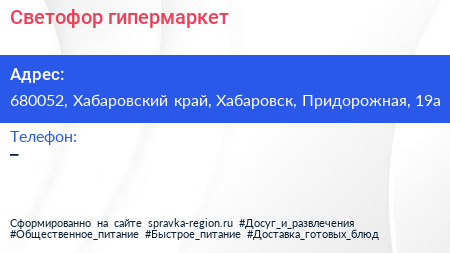 Светофор, гипермаркет по адресу 680052, Хабаровский край, Хабаровск, Придорожная, 19а в дальнейшем Организация, размещена в следующих категориях: