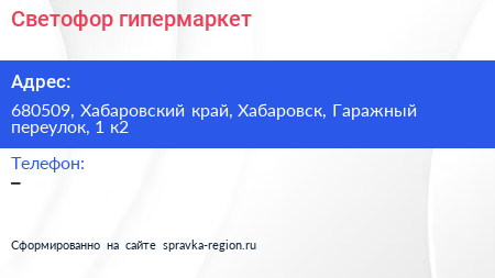 Светофор, гипермаркет по адресу 680509, Хабаровский край, Хабаровск, Гаражный переулок, 1 к2 в дальнейшем Организация, размещена в следующих категориях: