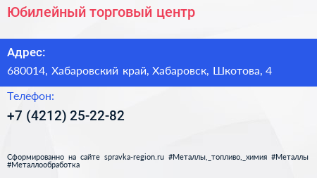 Юбилейный, торговый центр по адресу 680014, Хабаровский край, Хабаровск, Шкотова, 4 в дальнейшем Организация, размещена в следующих категориях: