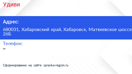 Удиви по адресу 680031, Хабаровский край, Хабаровск, Матвеевское шоссе, 26Б в дальнейшем Организация, размещена в следующих категориях: