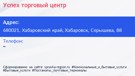 Успех, торговый центр по адресу 680021, Хабаровский край, Хабаровск, Серышева, 88 в дальнейшем Организация, размещена в следующих категориях: