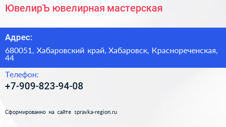 ЮвелирЪ, ювелирная мастерская по адресу 680051, Хабаровский край, Хабаровск, Краснореченская, 44 в дальнейшем Организация, размещена в следующих категориях: