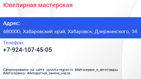Ювелирная мастерская по адресу 680000, Хабаровский край, Хабаровск, Дзержинского, 34 в дальнейшем Организация, размещена в следующих категориях: