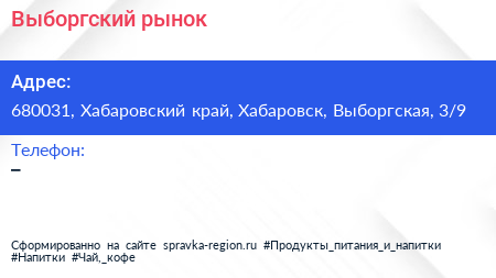 Выборгский, рынок по адресу 680031, Хабаровский край, Хабаровск, Выборгская, 3/9 в дальнейшем Организация, размещена в следующих категориях: