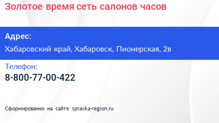 Золотое время, сеть салонов часов по адресу Хабаровский край, Хабаровск, Пионерская, 2в в дальнейшем Организация, размещена в следующих категориях: