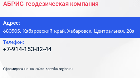 АБРИС, геодезическая компания по адресу 680505, Хабаровский край, Хабаровск, Центральная, 28а в дальнейшем Организация, размещена в следующих категориях:
