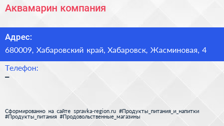 Аквамарин, компания по адресу 680009, Хабаровский край, Хабаровск, Жасминовая, 4 в дальнейшем Организация, размещена в следующих категориях: