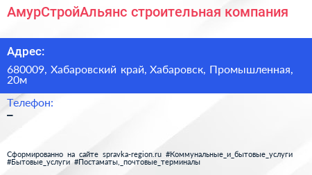 АмурСтройАльянс, строительная компания по адресу 680009, Хабаровский край, Хабаровск, Промышленная, 20м в дальнейшем Организация, размещена в следующих категориях: