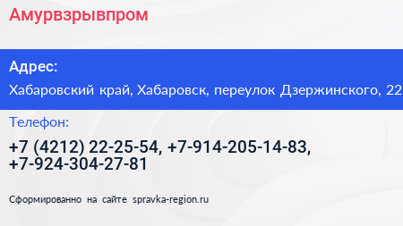 Амурвзрывпром по адресу Хабаровский край, Хабаровск, переулок Дзержинского, 22 в дальнейшем Организация, размещена в следующих категориях: