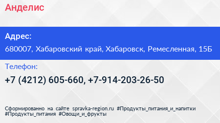 Анделис по адресу 680007, Хабаровский край, Хабаровск, Ремесленная, 15Б в дальнейшем Организация, размещена в следующих категориях: