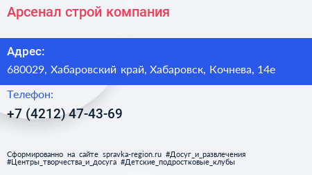 Арсенал строй, компания по адресу 680029, Хабаровский край, Хабаровск, Кочнева, 14е в дальнейшем Организация, размещена в следующих категориях: