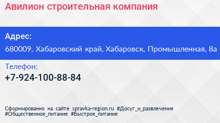 Авилион, строительная компания по адресу 680009, Хабаровский край, Хабаровск, Промышленная, 8а в дальнейшем Организация, размещена в следующих категориях: