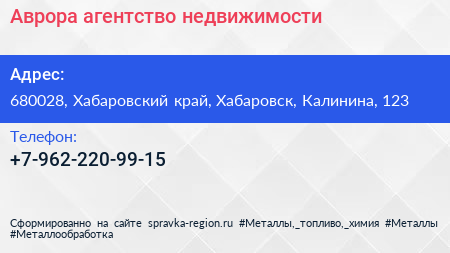 Аврора, агентство недвижимости по адресу 680028, Хабаровский край, Хабаровск, Калинина, 123 в дальнейшем Организация, размещена в следующих категориях: