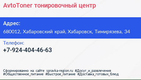 AvtoToner, тонировочный центр по адресу 680012, Хабаровский край, Хабаровск, Тимирязева, 34 в дальнейшем Организация, размещена в следующих категориях: