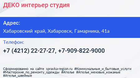 ДЕКО, интерьер-студия по адресу Хабаровский край, Хабаровск, Гамарника, 41а в дальнейшем Организация, размещена в следующих категориях: