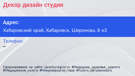 Декор, дизайн-студия по адресу Хабаровский край, Хабаровск, Шеронова, 8 к3 в дальнейшем Организация, размещена в следующих категориях: