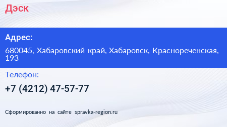 Дэск по адресу 680045, Хабаровский край, Хабаровск, Краснореченская, 193 в дальнейшем Организация, размещена в следующих категориях: