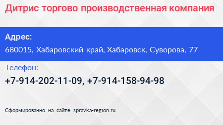 Дитрис, торгово-производственная компания по адресу 680015, Хабаровский край, Хабаровск, Суворова, 77 в дальнейшем Организация, размещена в следующих категориях: