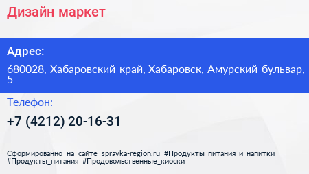 Дизайн маркет по адресу 680028, Хабаровский край, Хабаровск, Амурский бульвар, 5 в дальнейшем Организация, размещена в следующих категориях: