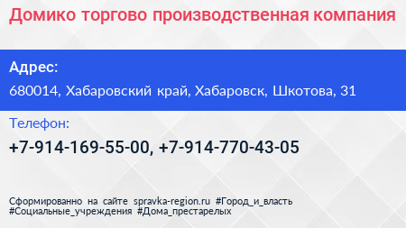 Домико, торгово-производственная компания по адресу 680014, Хабаровский край, Хабаровск, Шкотова, 31 в дальнейшем Организация, размещена в следующих категориях: