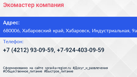 Экомастер, компания по адресу 680006, Хабаровский край, Хабаровск, Индустриальная, 9а в дальнейшем Организация, размещена в следующих категориях: