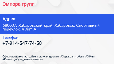 Эмпора групп по адресу 680007, Хабаровский край, Хабаровск, Спортивный переулок, 4 лит А в дальнейшем Организация, размещена в следующих категориях: